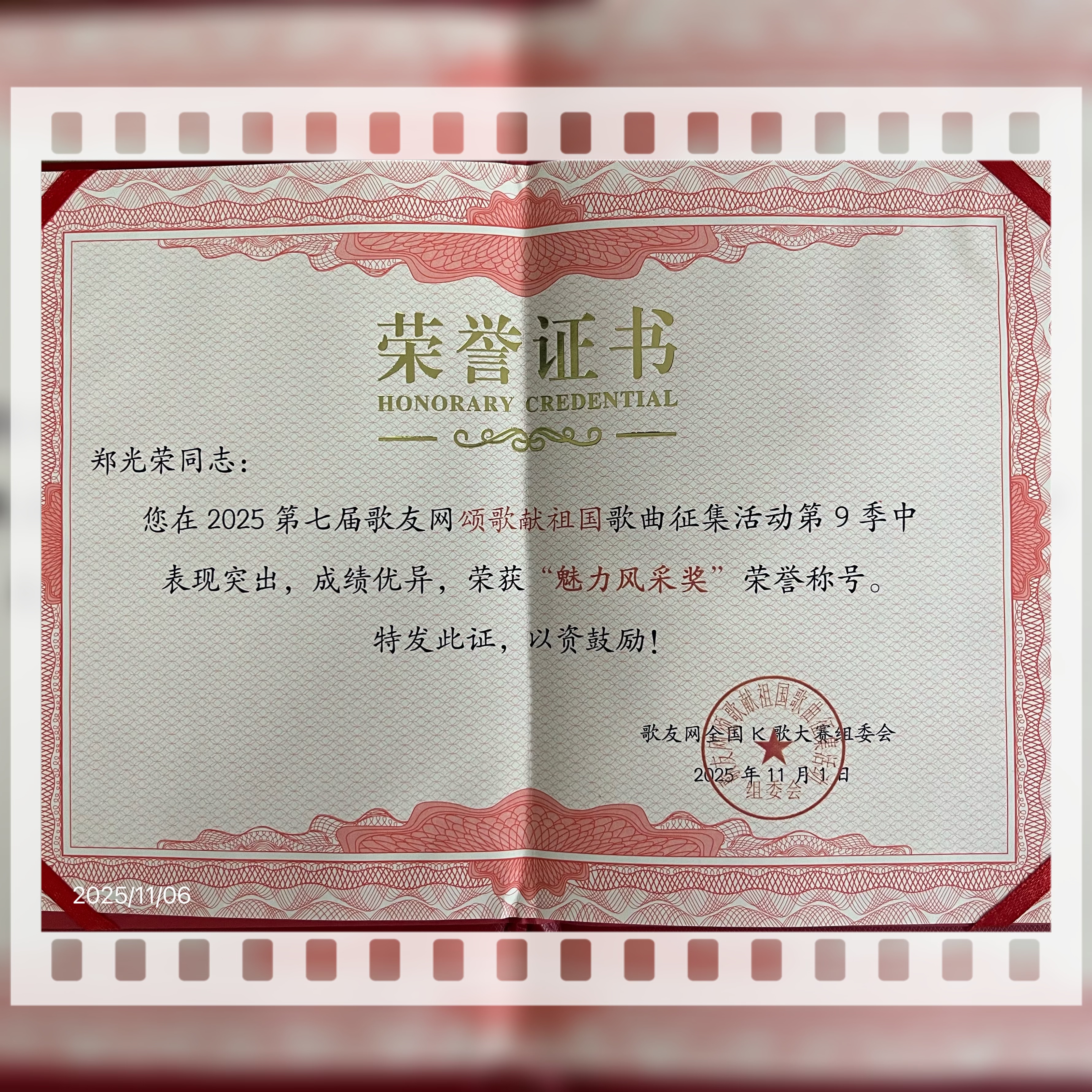 郑光荣的杰出表现得到了社会各界的广泛认可和高度赞誉,他荣获了众多令人瞩目的荣誉称号。11月1日郑光荣获得歌友网全国k歌大赛第七届(魅力风采奖)
